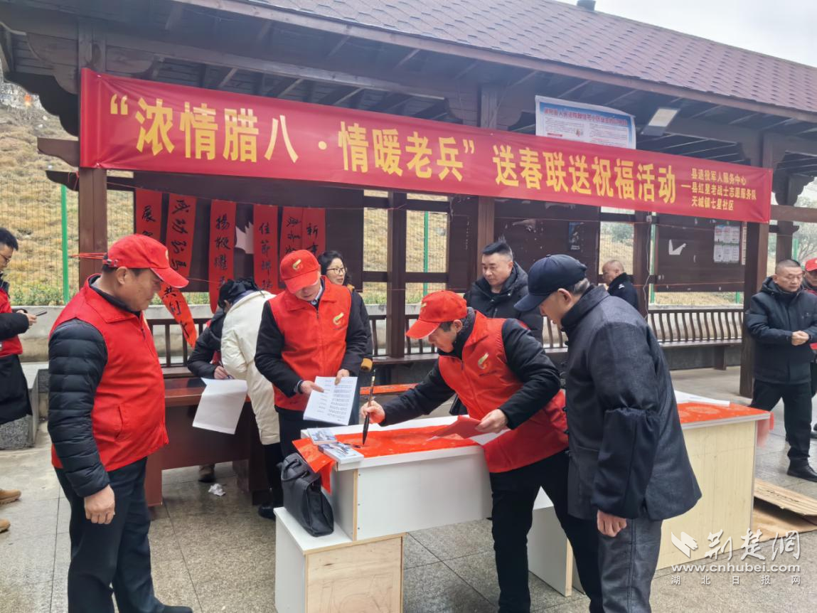 荆楚网(湖北日报网)讯(通讯员黄果)腊八节至,年味渐浓。为进一步弘扬拥军优属光荣传统,营造尊崇关爱退役军人的浓厚社会氛围,1月26日,崇阳县退役军人服务中心联合县红星老战士志愿服务队、天城镇七星社区,在兴业苑小区共同举办了“浓情腊八·情暖老兵”送春联送祝福主题活动,为退役军人及其他优抚对象、驻崇部队官兵送去节日的问候与诚挚的祝福。
