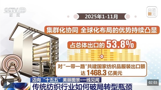 2025年1—11月,我国纺织行业规模以上企业工业增加值同比增长1.7%,限额以上服装、鞋帽、针纺织品类商品零售额超1.3万亿元,同比增长3.5%;对 “一带一路”共建国家纺织品服装出口额达1468.3亿美元,占总体出口的53.8%,集群化协同、全球化布局的优势持续凸显。
