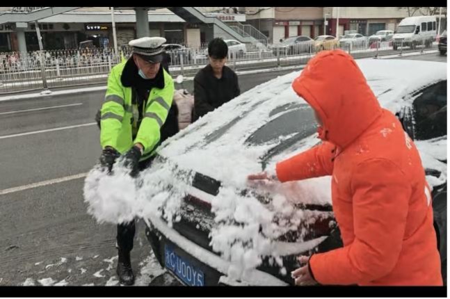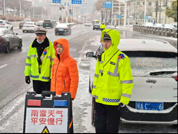 平安产险湖北分公司武汉中支携手武昌区交警大队在徐东大街二桥上桥闸道,武昌南站武南天桥两个定位设置警示牌,提醒过往车主雪天路滑,平安慢行,并为过往车主车上清理积雪,警保联动快速处理事故。