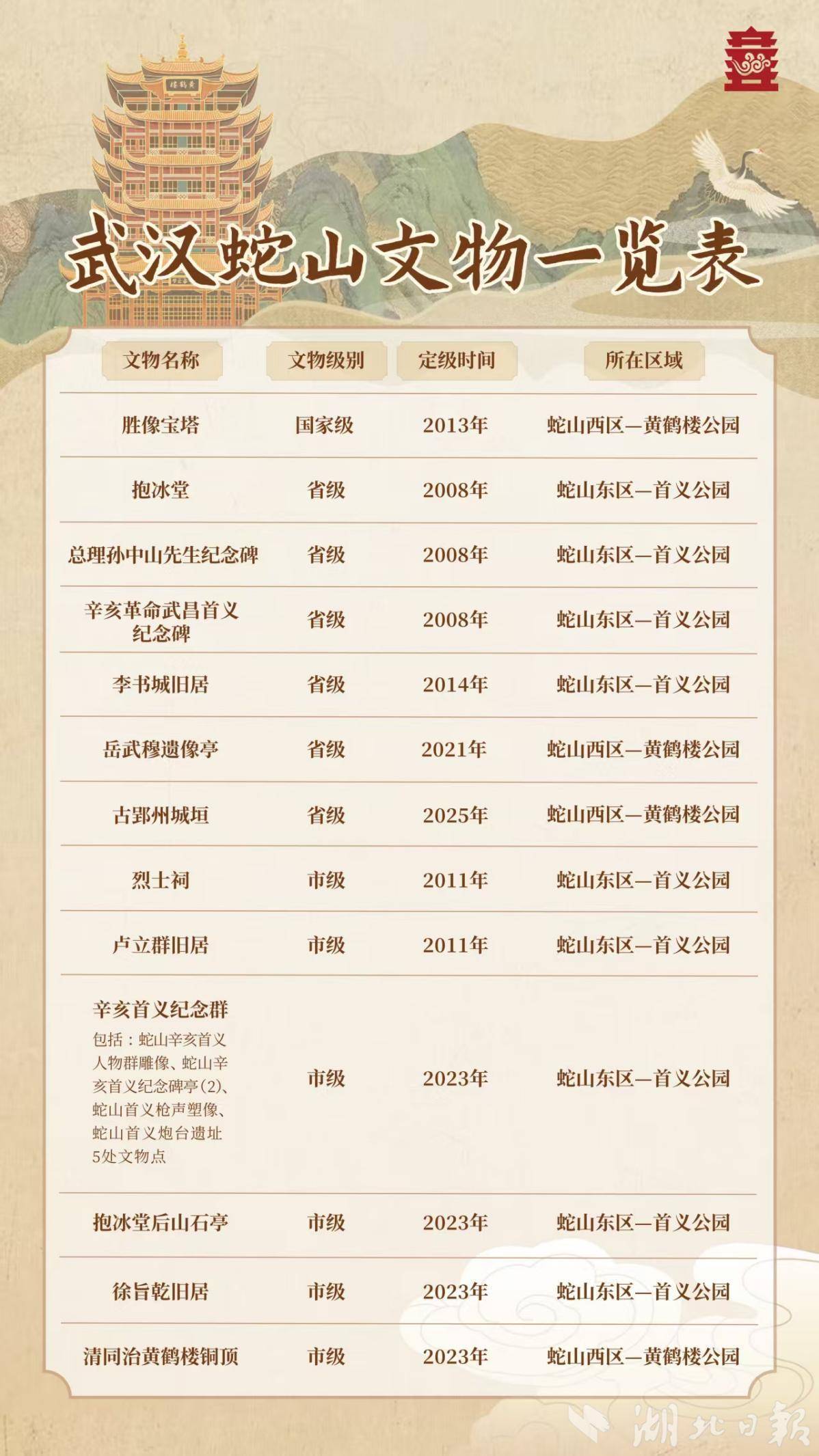 武汉文史馆特约研究员刘谦定认为,蛇山呈现出“一文一武”的文化格局:“西侧以黄鹤楼为核心,承载诗词文脉;东侧以首义公园为代表,见证辛亥风云。两者通过古郢州城垣、明城墙基址等历史遗存连接,形成武昌城独特的历史轴线。”