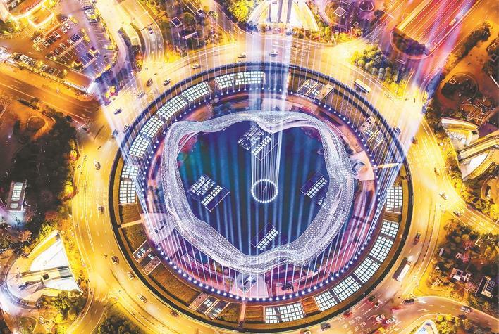 光谷星河广场灯光璀璨,宛若“行星发动机”。 (薛婷 摄)