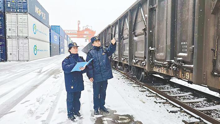 汉口海关车站监管科关员对中欧班列场地开展巡查。 (受访单位供图)