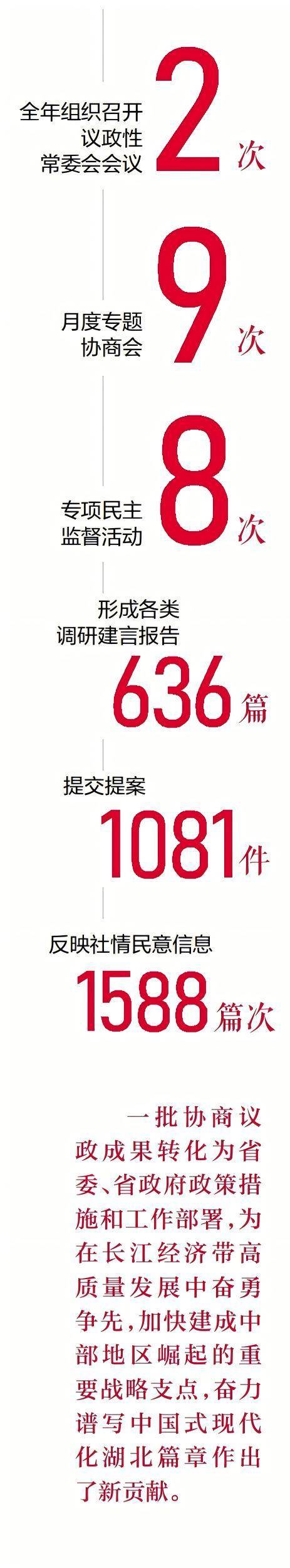 在中共湖北省委坚强领导下,省政协及其常委会坚持以习近平新时代中国特色社会主义思想为指导,坚定拥护“两个确立”、坚决做到“两个维护”,全面贯彻落实中共二十大和二十届历次全会精神,深入学习贯彻习近平总书记关于加强和改进人民政协工作的重要思想、考察湖北重要讲话精神,坚持党的领导、统一战线、协商民主有机结合,在凝聚合力上画好“同心圆”、在建言资政上当好“智囊团”、在为民服务上架好“连心桥”、在促进发展上成为“生力军”,充分发挥了专门协商机构作用。