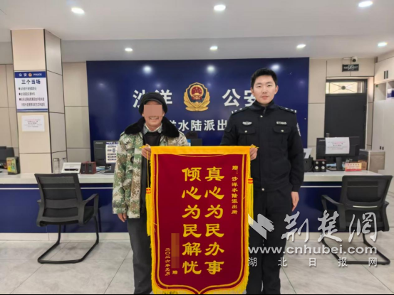 沙洋镇居民王大爷向沙洋县公安局沙洋水陆派出所赠送锦旗。通讯员供图