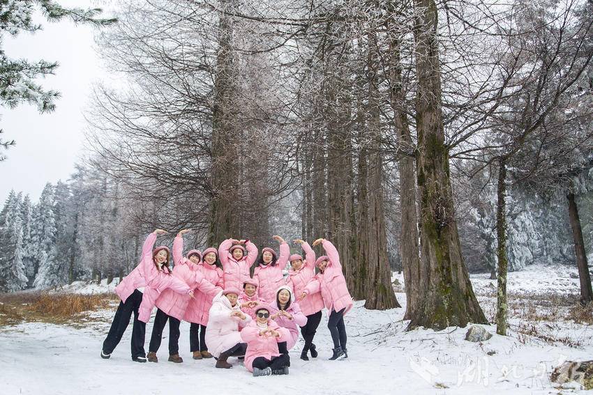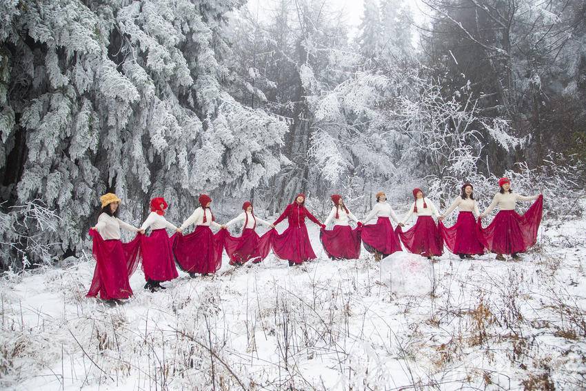 银裳铺就的天地间,几抹嫣红撞入眼帘,成了冰雪里最鲜活的亮色。绿葱坡的森林公园雪地上,十几位身着粉色羽衣的游人围作半圈,抬手比心、屈膝比耶,蓬松粉绒与皑皑白雪相映,青春的笑意揉碎在风里,温柔了整个雪野。不远处的林间空地,一抹抹鲜亮红裙在雪色间流动,游人们手拉手舒展裙摆,红焰灼灼,在雾凇林的素白映衬下,将生命的鲜活与烂漫绽放在高山雪地之上。