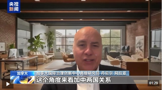 加拿大国际治理创新中心高级研究员 丹尼尔·阿拉亚:在我看来,加中两国关系是完美的互补,我认为如果从构建新型战略伙伴关系,这个角度来看加中两国关系,意味着两国未来会有更全面的合作。如果我们能够进入中国这个庞大且有竞争力的市场,无论是最初从油菜籽和初级产品生产领域,还是逐步向价值链上游延伸至服务业,这对加拿大企业来说都是巨大的机遇。