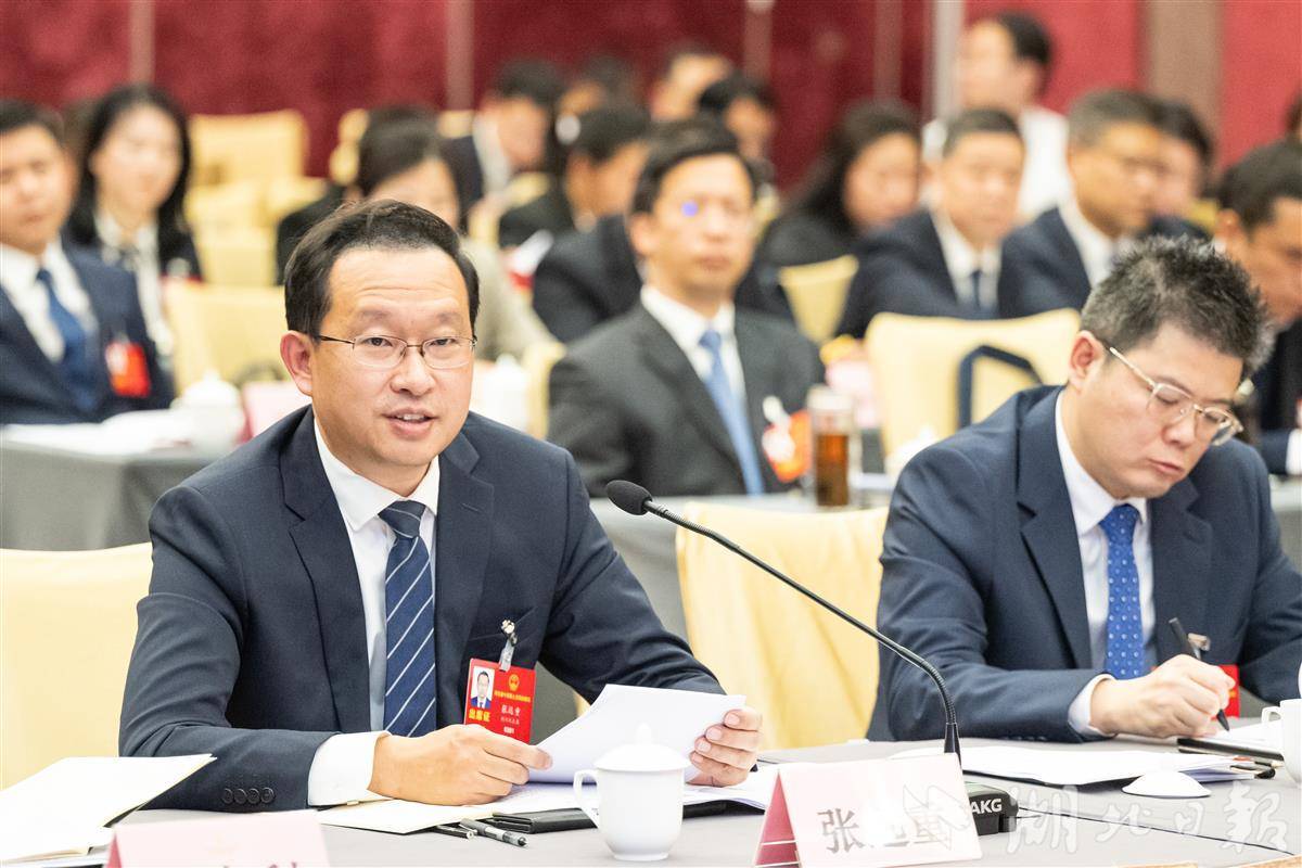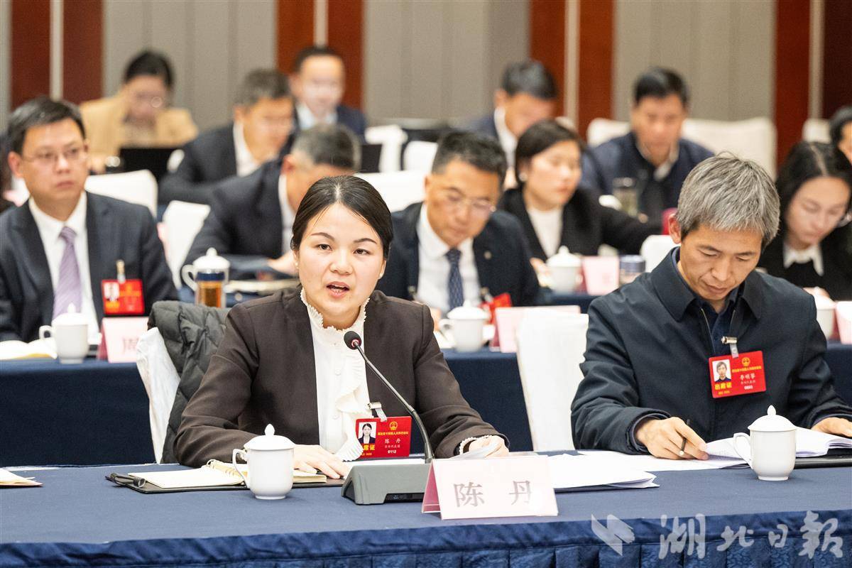 1月27日,黄冈市代表团审议省政府工作报告,省人大代表陈丹(左)发言。(湖北日报全媒记者 任勇 摄)