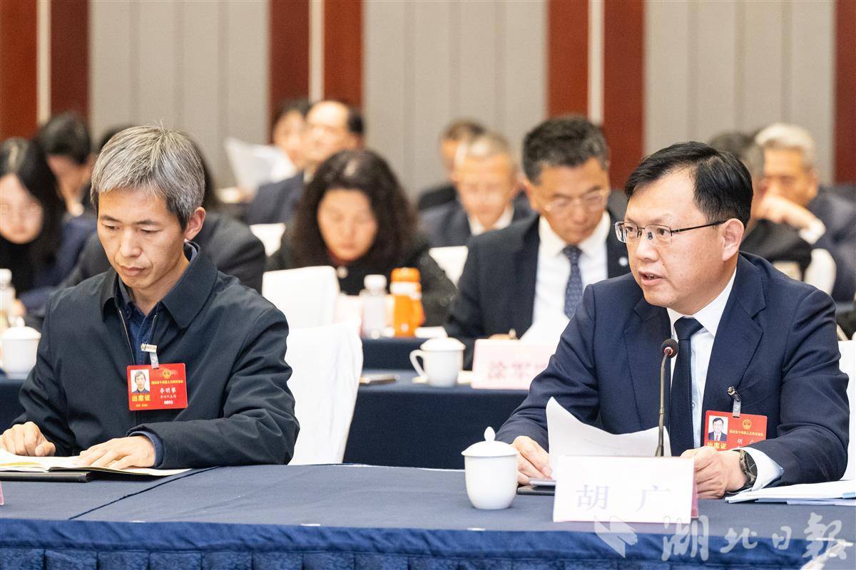 1月27日,黄冈市代表团审议省政府工作报告,省人大代表胡广(右)发言。(湖北日报全媒记者 任勇 摄)