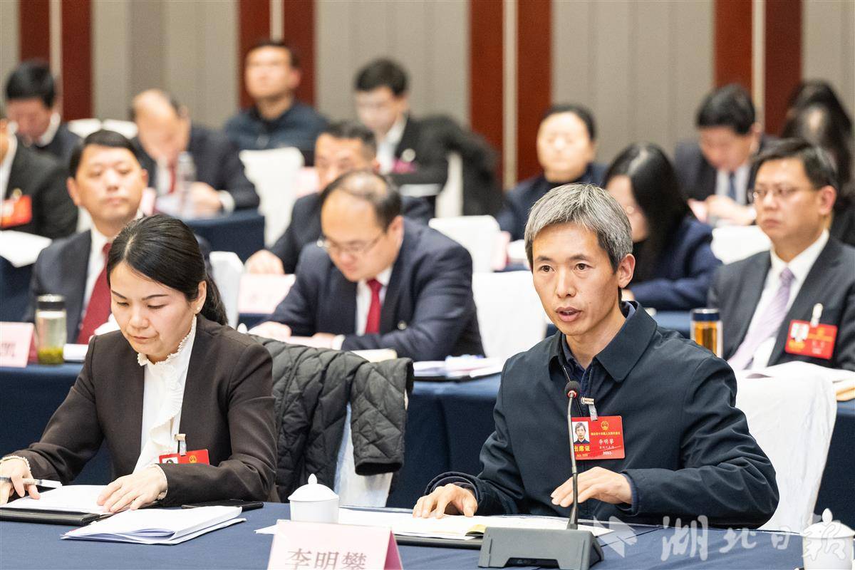 1月27日,黄冈市代表团审议省政府工作报告,省人大代表李明攀(右)发言。(湖北日报全媒记者 任勇 摄)