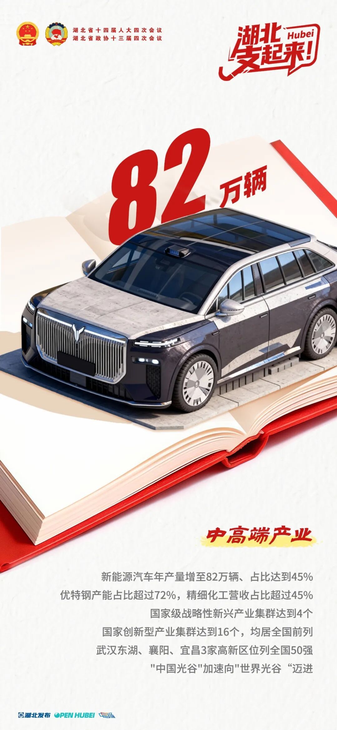 新能源汽车年产量增至82万辆、占比达到45%,优特钢产能占比超过72%,精细化工营收占比超过45%;国家级战略性新兴产业集群达到4个,国家创新型产业集群达到16个,均居全国前列。武汉东湖、襄阳、宜昌3家高新区位列全国50强,“中国光谷”加速向“世界光谷”迈进。