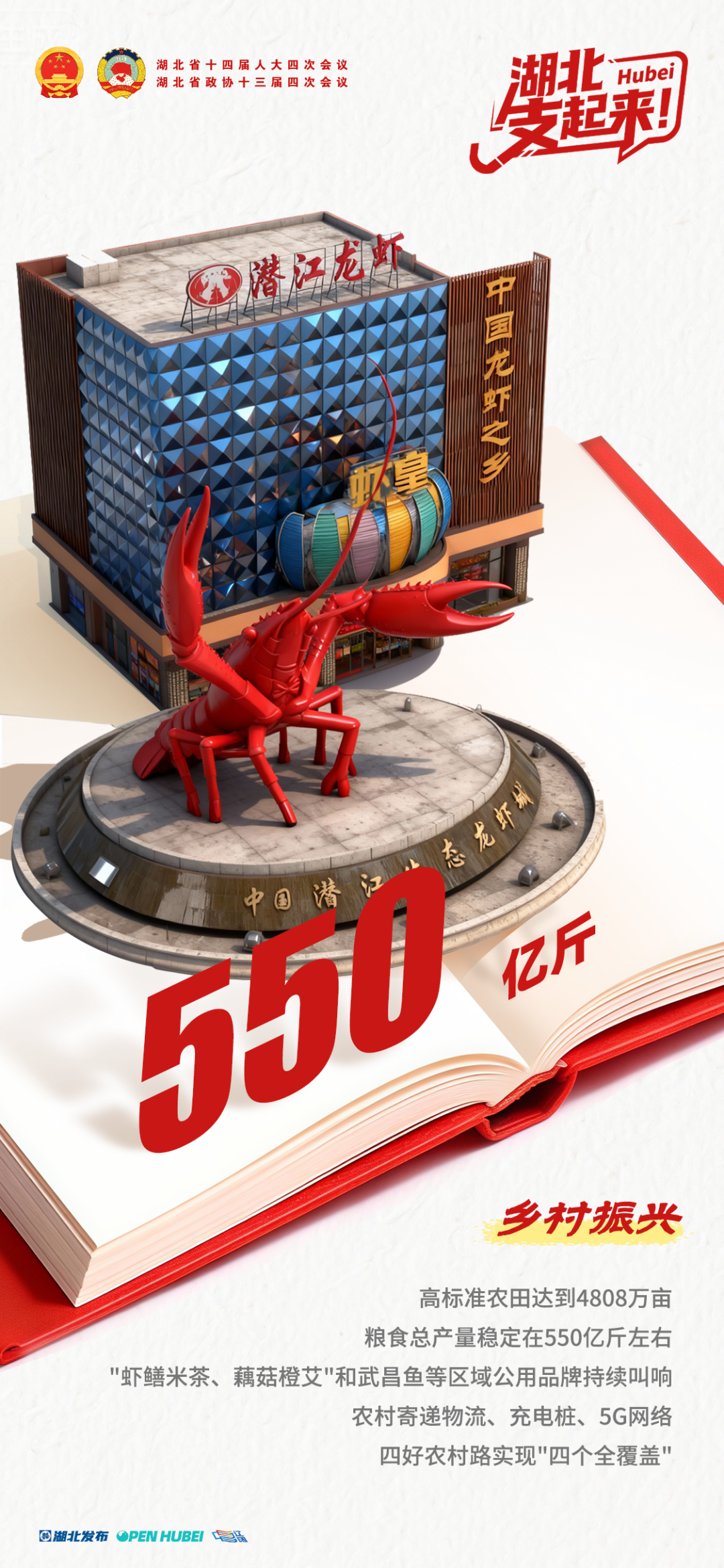 乡村振兴战略深入实施,高标准农田达到4808万亩,粮食总产量稳定在550亿斤左右,“虾鳝米茶、藕菇橙艾”和武昌鱼等区域公用品牌持续叫响,农村寄递物流、充电桩、5G网络、四好农村路实现“四个全覆盖”,赤壁、恩施等14个县市获批创建国家乡村振兴示范县,湖北在国家脱贫攻坚年度考核评估中实现“九连好”。