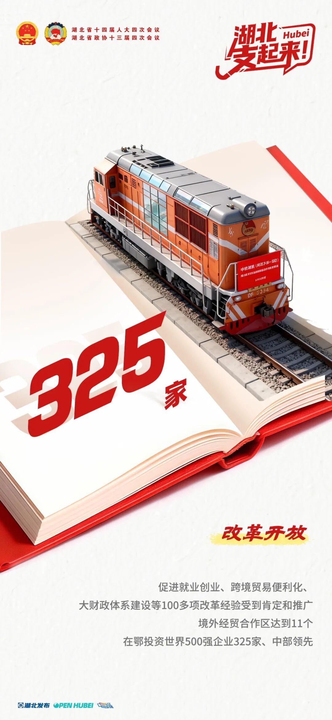 促进就业创业、跨境贸易便利化、大财政体系建设等100多项改革经验受到肯定和推广,境外经贸合作区达到11个,在鄂投资世界500强企业325家、中部领先。