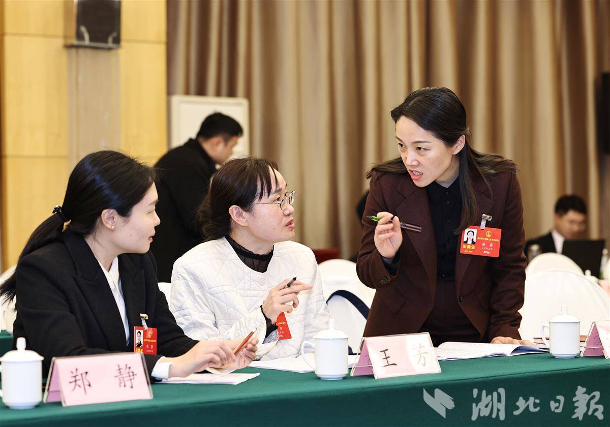 1月27日,咸宁市代表团代表郑静(左)、王芳(中)、潘蕾(右)在小组会后热议省政府工作报告。(湖北日报全媒记者 陈迹 摄)
