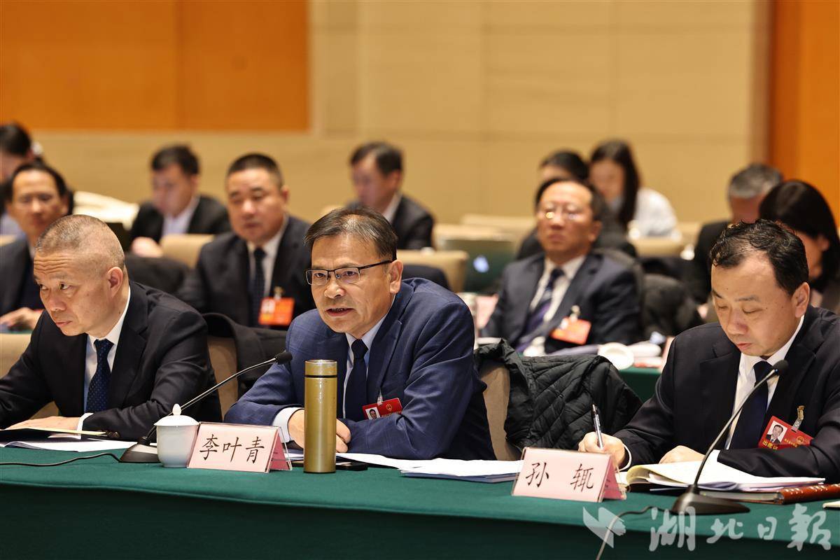 1月27日,黄石市代表团审议省政府工作报告,省人大代表李叶青(中)发言。(湖北日报全媒记者 陈迹 摄)