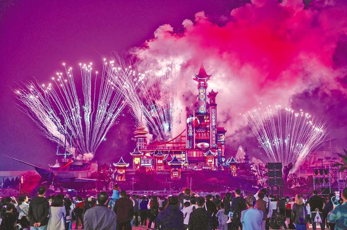 游客在襄阳市华侨城奇幻度假区观看奇梦城堡光影秀。(视界网 杨东 摄)