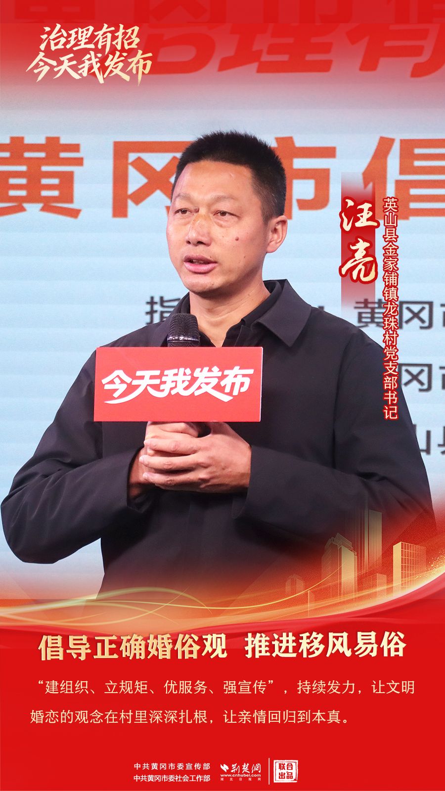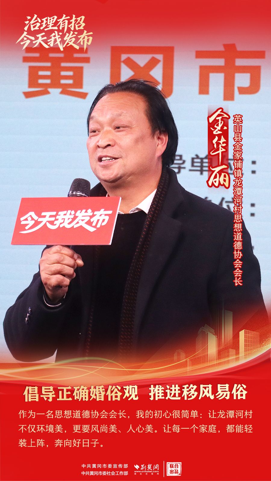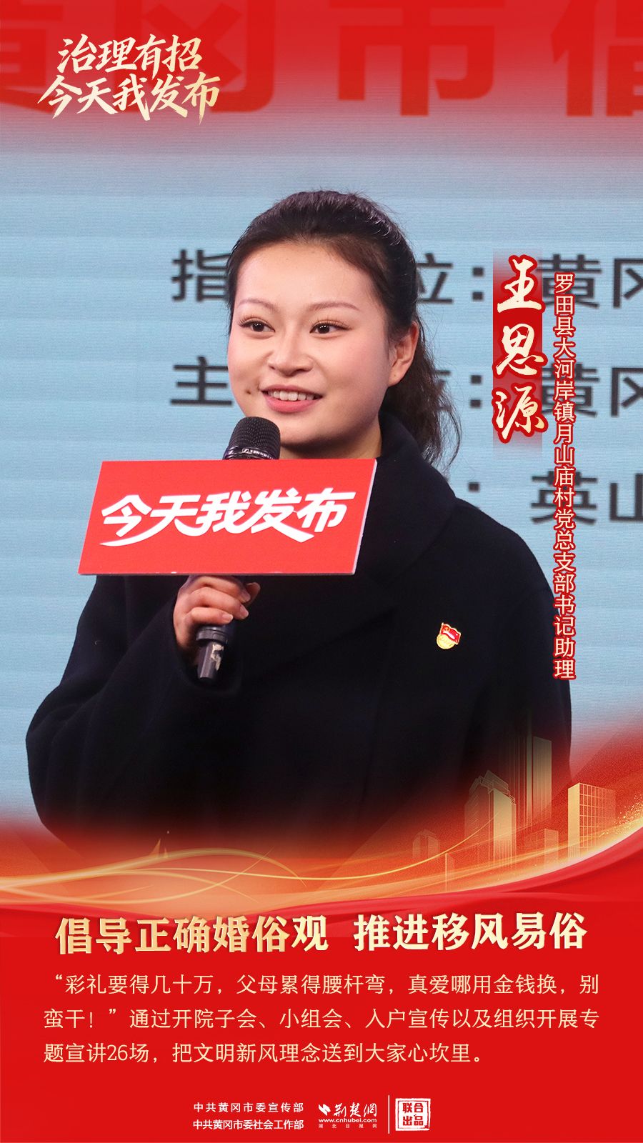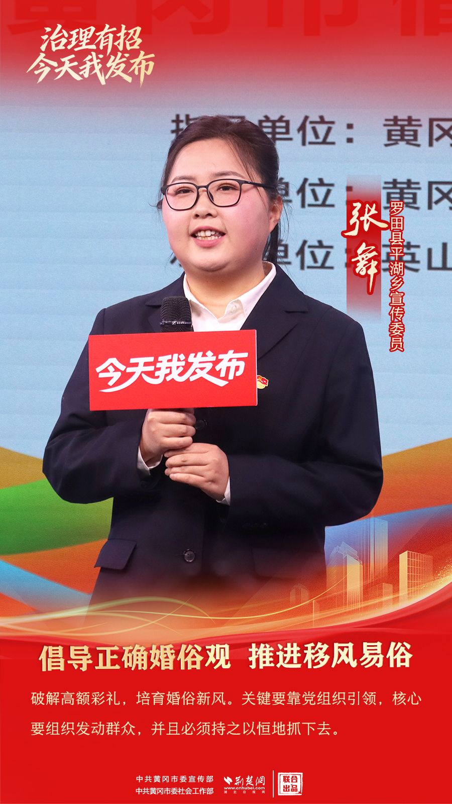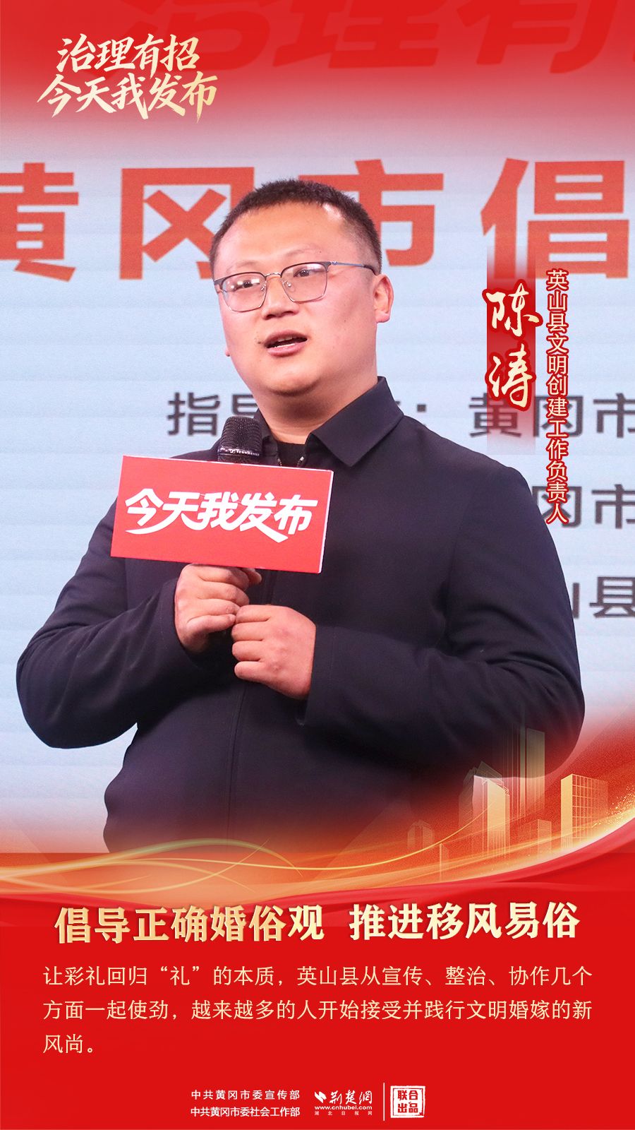 荆楚网(湖北日报网)讯(记者胡小军、刘璐 通讯员郭斯、席想楼)1月27日,由黄冈市委宣传部(市政府新闻办)指导、黄冈市委社会工作部主办、英山县委社会工作部和罗田县委社会工作部承办的“治理有招·今天我发布”黄冈市倡导文明婚俗专场在市融媒体中心举行,来自英山县、罗田县6位发布人分享倡导文明婚俗的故事。