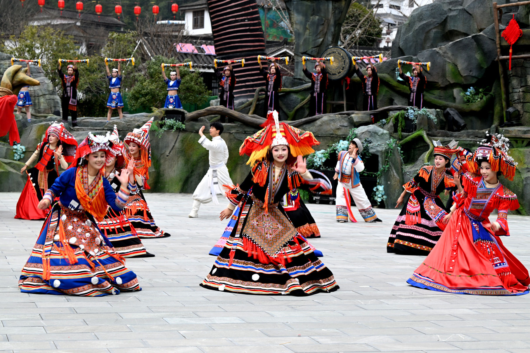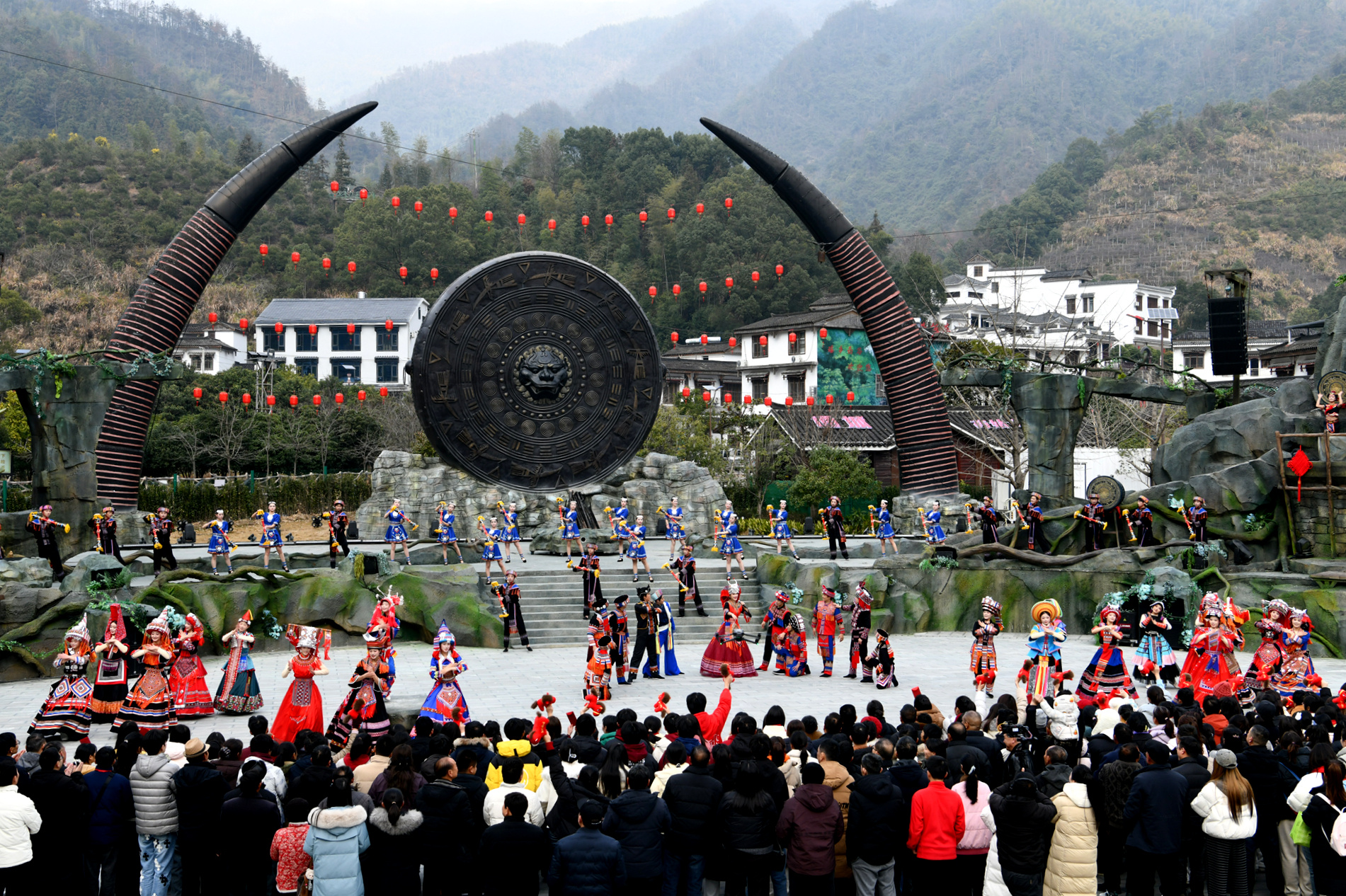 2026年1月27日,游客在湖北省咸宁市通城县药姑山古瑶村景区观看《龙船调》表演。