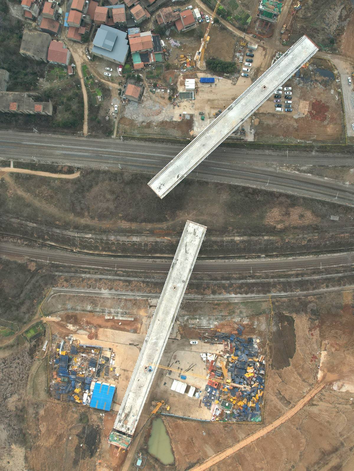 1月28日,合武高铁塘埠口滠水特大桥400号墩连续梁(左)顺利完成转体,与此前已就位的399号墩连续梁实现“空中牵手”。