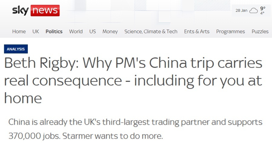 英国天空新闻台网站的报道援引斯塔默行前的表态指出,中国对英国至关重要。作为全球最主要的经济体之一,与中方保持战略稳定关系完全符合英国的国家利益。报道说,中国已是英国第三大贸易伙伴,支撑着37万个就业岗位。斯塔默希望进一步深化合作。同时,中国也希望在投资和出口方面扩大对英国市场的准入。