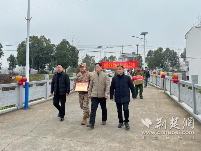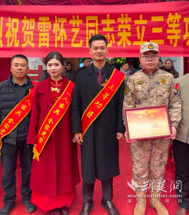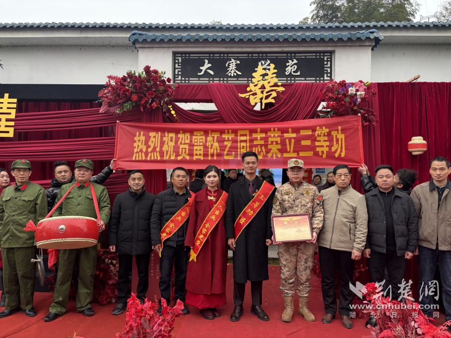 荆楚网(湖北日报网)讯(通讯员常梦星 夏慧敏)1月28日,崇阳县退役军人事务局联合县人武部、相关乡镇组成报喜团,专程将三等功喜报送到了现役军人雷怀艺的婚礼现场。这份承载着军人荣耀的“贺礼”,让婚礼现场更添荣光,有力弘扬了拥军优属的优良传统。