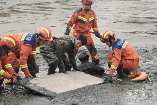 岸边消防救援人员紧握安全绳做好牵引,泥潭中的消防救援人员合力托住老人的腋下和后背,借着木板的支撑缓缓发力。经过1小时紧张救援,老人终于被成功拉出淤泥。
