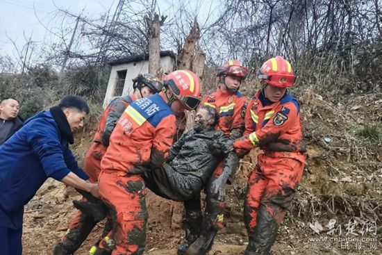 随后将老人抬至安全地带,因天气寒冷,室外温度仅3℃,为防止老人身体失温,消防救援人员现场生火并用温水将老人身上的泥浆清洗干净,同时用准备好的棉被将老人紧紧裹住。