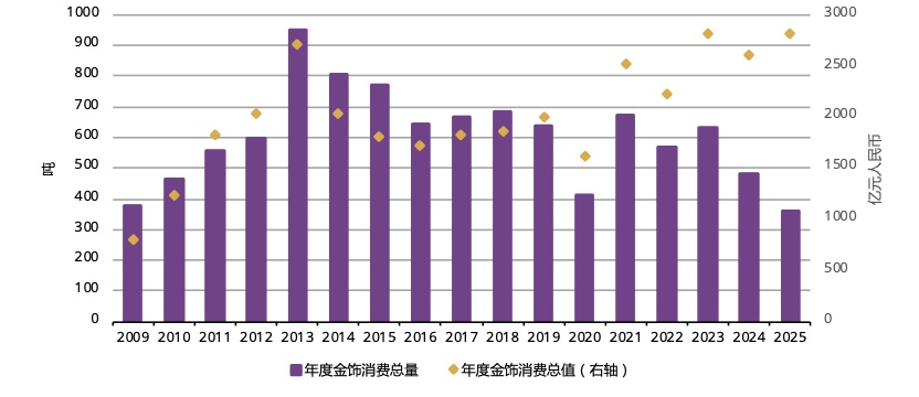 2025年全年,中国金饰需求总量达360吨,较2024年下降25%。但全年金饰消费总额达2814亿元,同比增长8%,与2023年2818亿元的历史记录相差无几——这也意味着,消费者对金饰消费的兴趣持续提升。