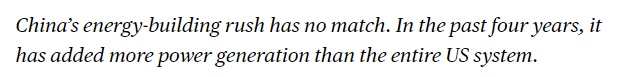 文章说,中国的能源建设速度无与伦比。过去四年,中国新增的发电容量超过了整个美国电力系统的总和。这种大规模能源基础设施投资帮助中国降低对化石燃料依赖,为人工智能数据中心等高耗能技术提供稳定电力供应,从而在全球科技竞争中获得显著优势。