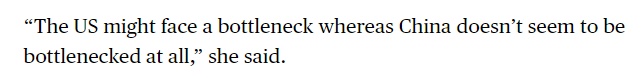 文章同时提到,相比之下,美国在几十年前电力需求似乎趋于平稳后,新增装机速度一直较慢。如今,随着人工智能的迅猛发展,美国正艰难应对数据中心等高耗能行业的电力需求,导致电力市场极为紧张。文章援引业内人士的话说:“美国可能会面临瓶颈,而中国似乎完全没有瓶颈。”