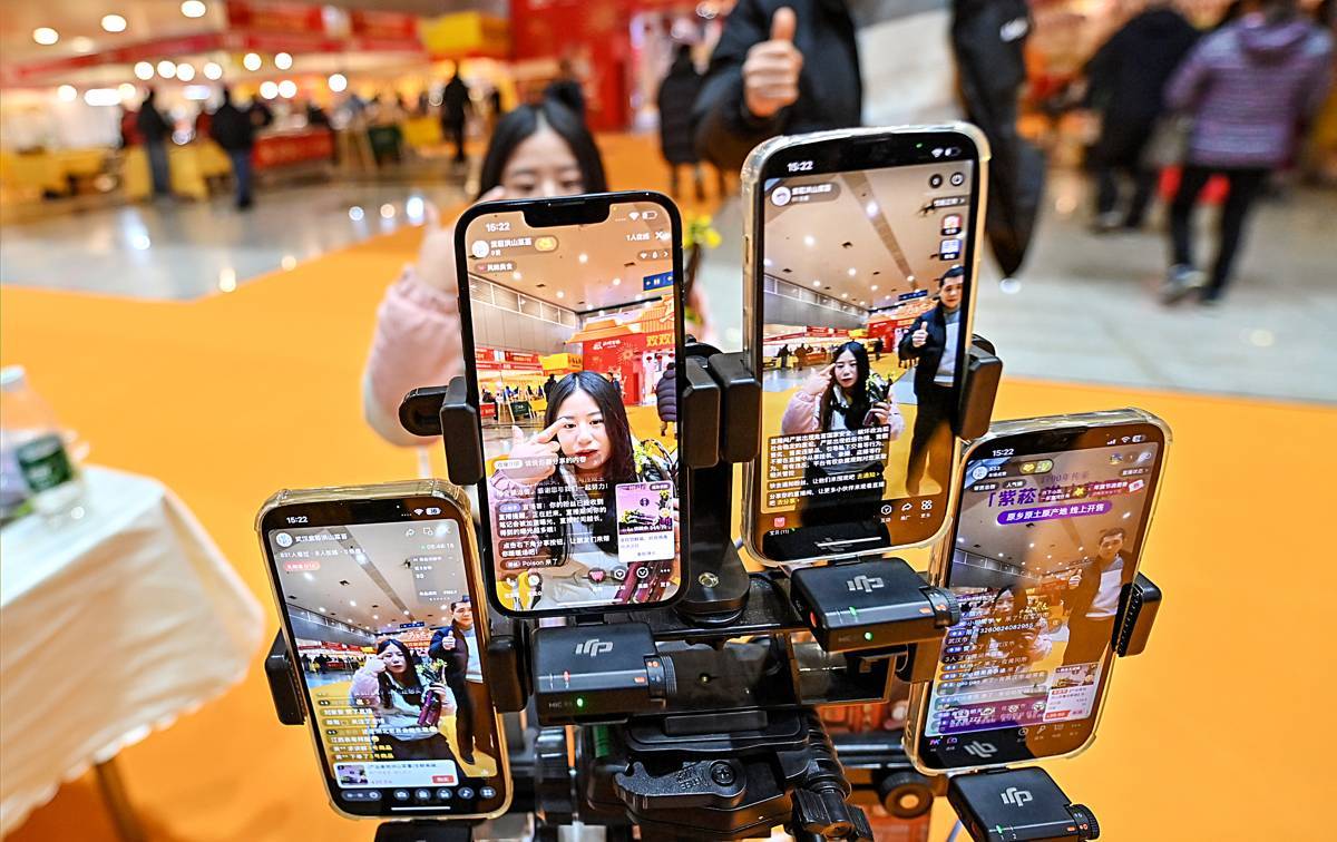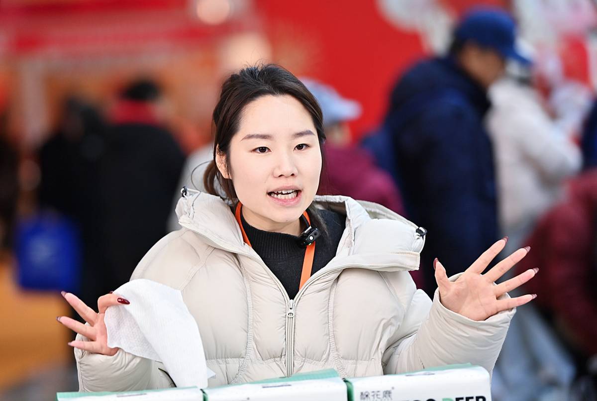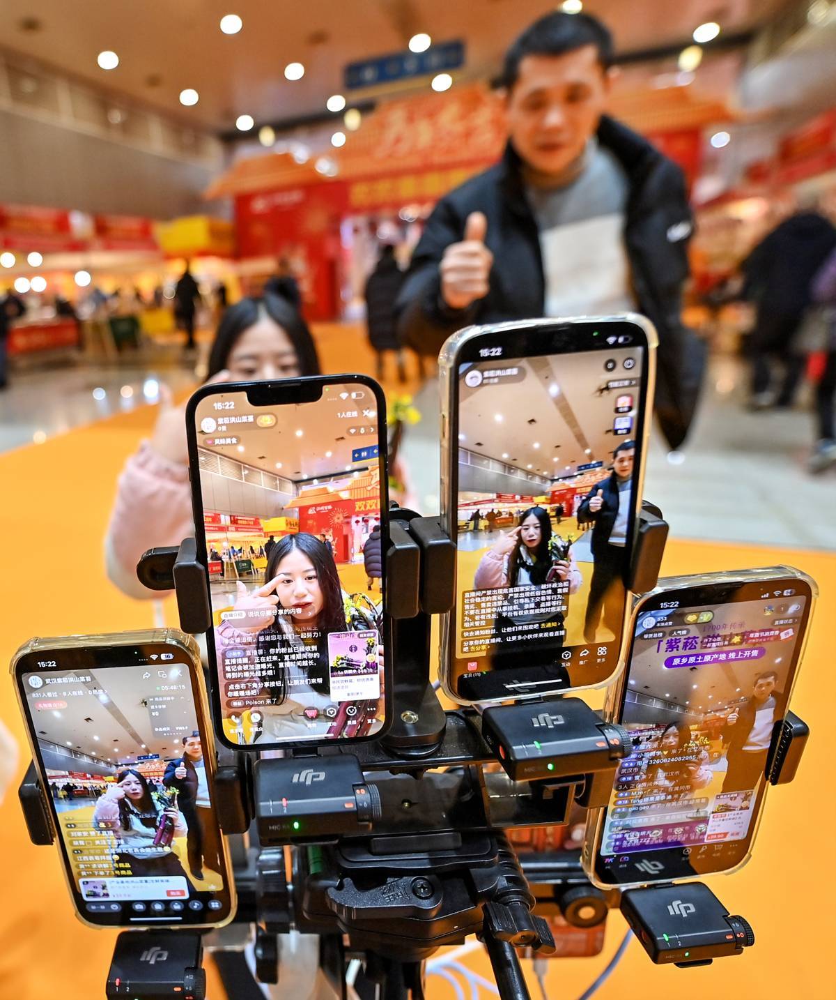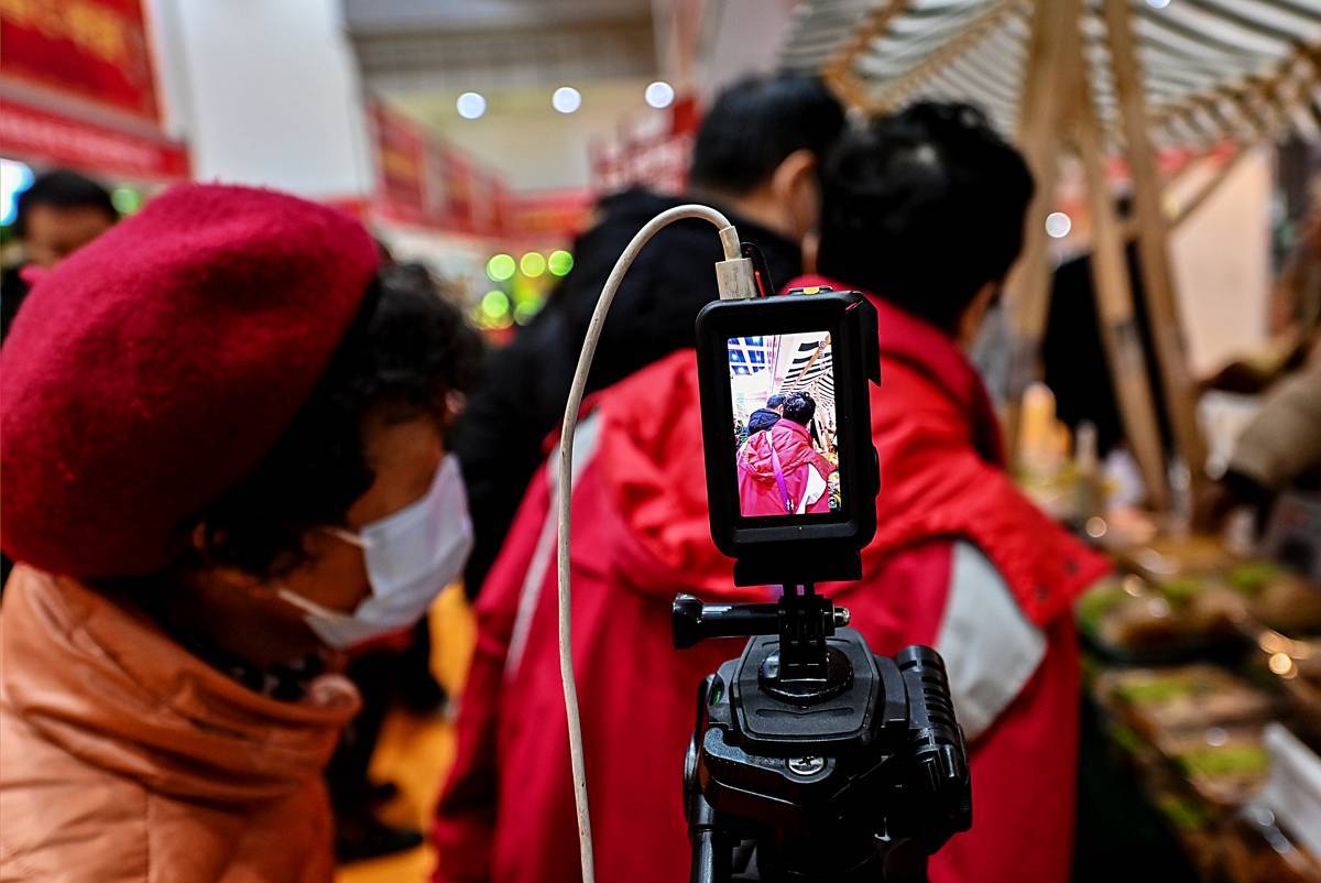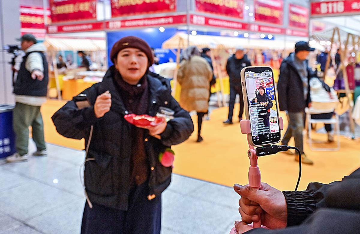 1月29日,2026迎春年货大集暨首届武汉圆子节在武汉国际会展中心(汉口)开幕。一些参展商采用“线上线下”并行的方式,线下展台陈列精品的同时,通过自家的APP在展会实况直播,为消费者同步展出了各种商品,吸粉无数。(湖北日报全媒记者 朱熙勇 摄)