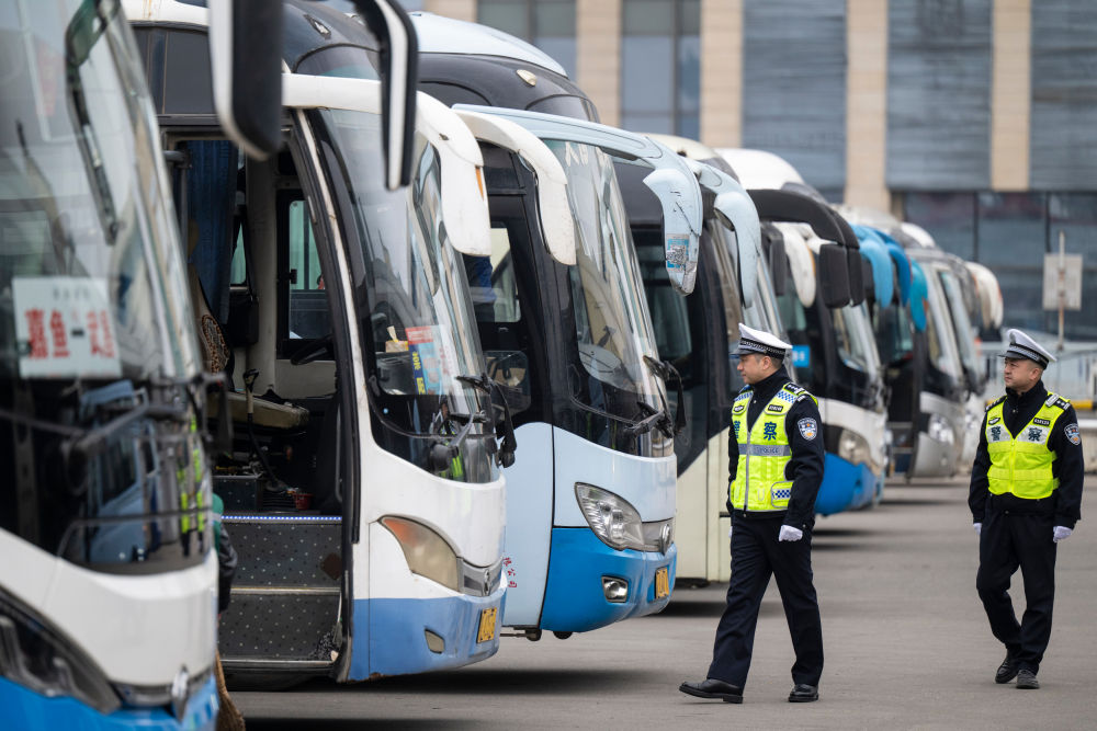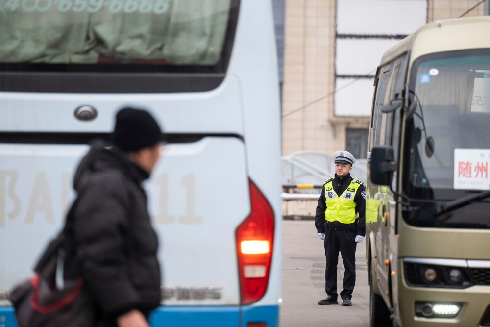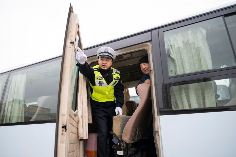 1月29日,在湖北省武汉市宏基长途客运汽车站,武汉交警对长途汽车进行安全检查。 新华社记者 伍志尊 摄