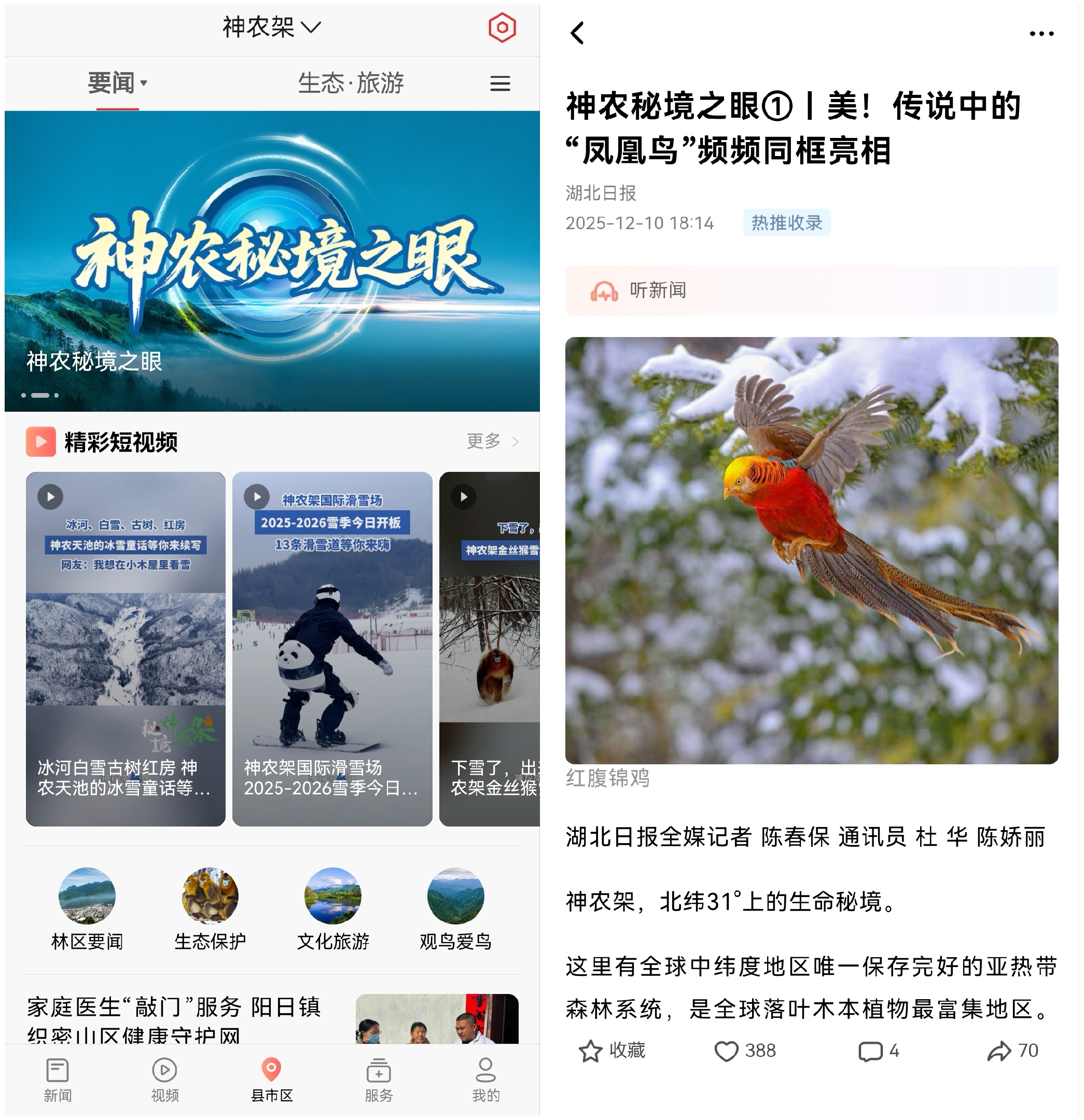 湖北日报神农架分社、湖北广电神农架记者站联手运营工作室,统筹推进品牌形象设计、选题策划等工作。工作室组建拍摄团队,梳理60多个选题制作短视频,推出《神农秘境之眼》专栏展现生态之美。建设“神农秘境”媒资库,整合区域媒介资源,支撑全媒体传播矩阵。通过搭建网上平台、整合信息资源,让群众更便捷地获取优质内容,把互联网建设成服务群众的新阵地。