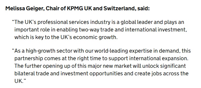 作为拥有世界级专业优势的高增长行业,此次合作恰逢其时,将有力支持国际业务拓展。(中国作为)重要市场进一步开放,将释放巨大的双边贸易投资潜力,并在全英创造就业机会。”