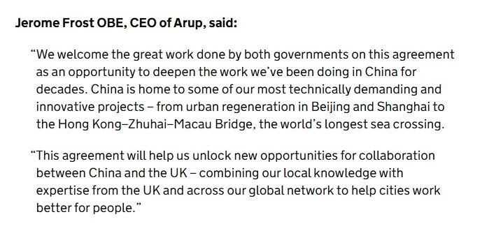 中国承载着我们最具技术挑战性与创新性的项目——从北京、上海的城市更新,到全球最长的跨海通道港珠澳大桥。英中之间的协议将帮助我们开启合作新机遇,结合我们在中国的本土化运营经验与来自英国及全球的专业知识,让城市服务更好地造福民众。”