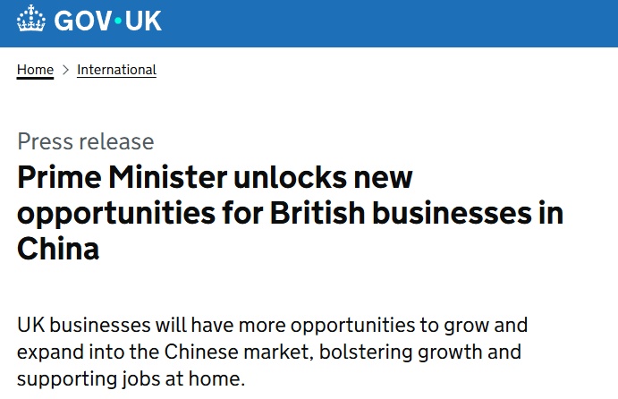 当地时间1月29日,英国政府官方网站专门刊发题为“首相访华为企业开辟新机遇”的新闻稿,宣示此访将为英国企业“解锁”更多在中国市场发展壮大的机会,支持英国经济增长并助力就业。