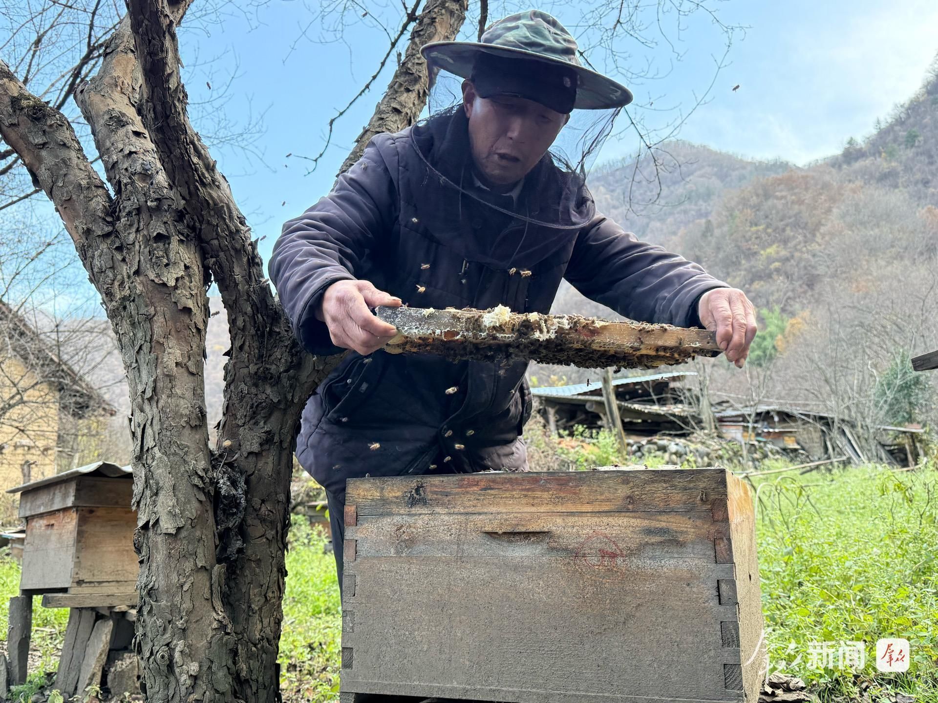 花耳坪村村民王友德正查看蜂箱