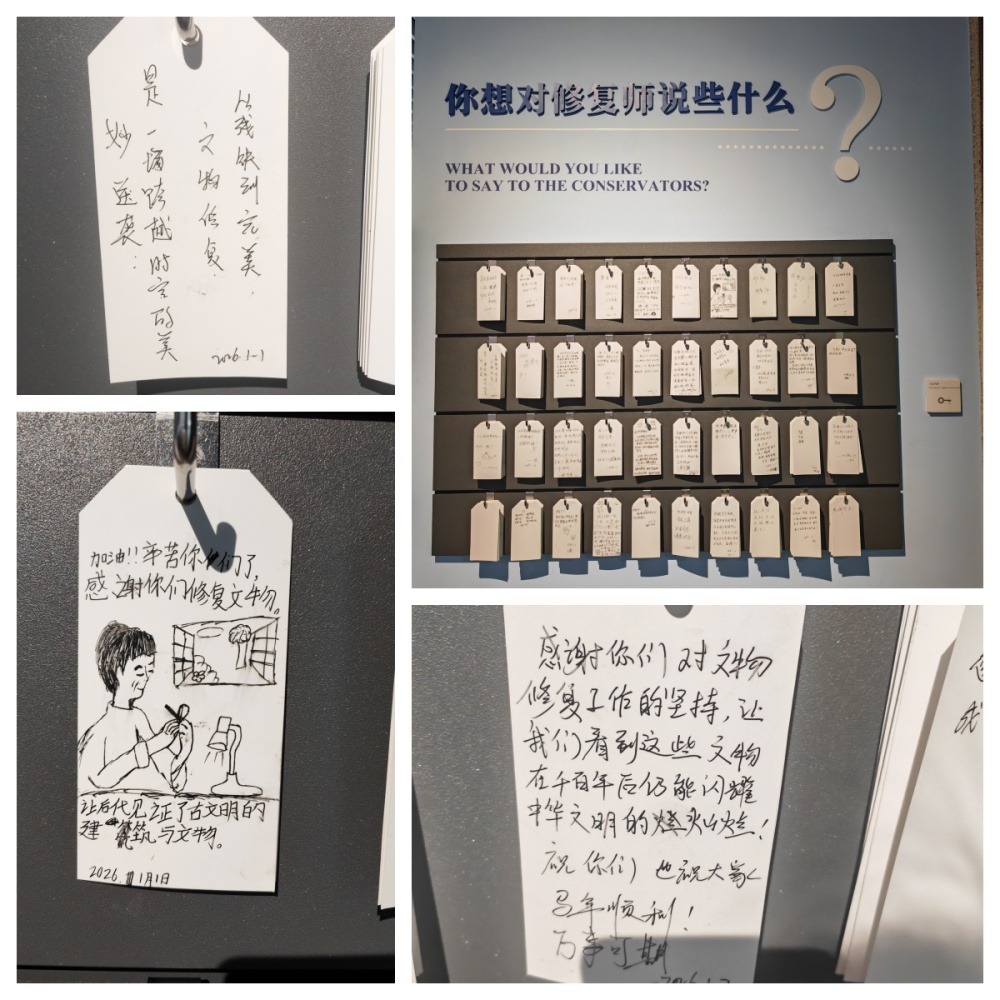 参展观众对文物修复师的寄语(拼版图片)。新华社记者 朱丽莉 摄