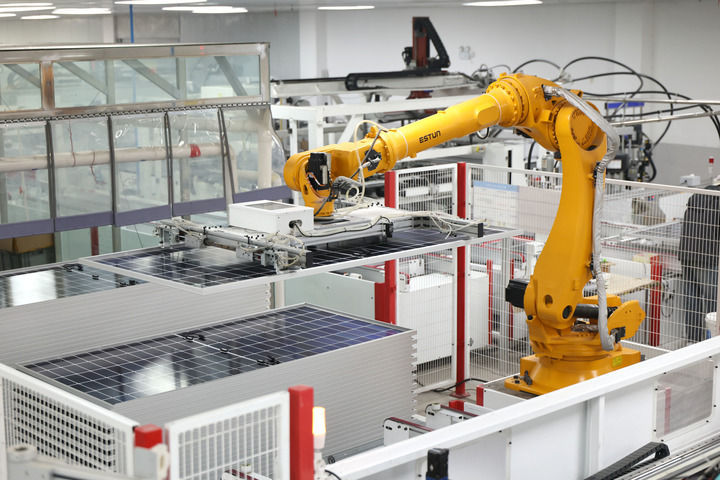 在江苏省淮安市洪泽区新源太阳能科技有限公司生产车间内,工业机器人在生产太阳能光伏组件(2025年12月17日摄)。新华社发(殷潮 摄)