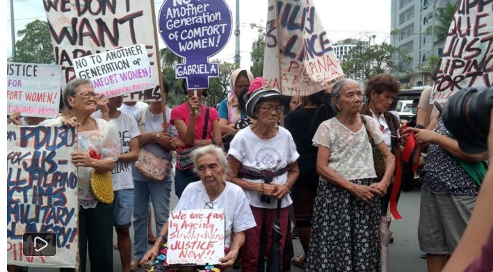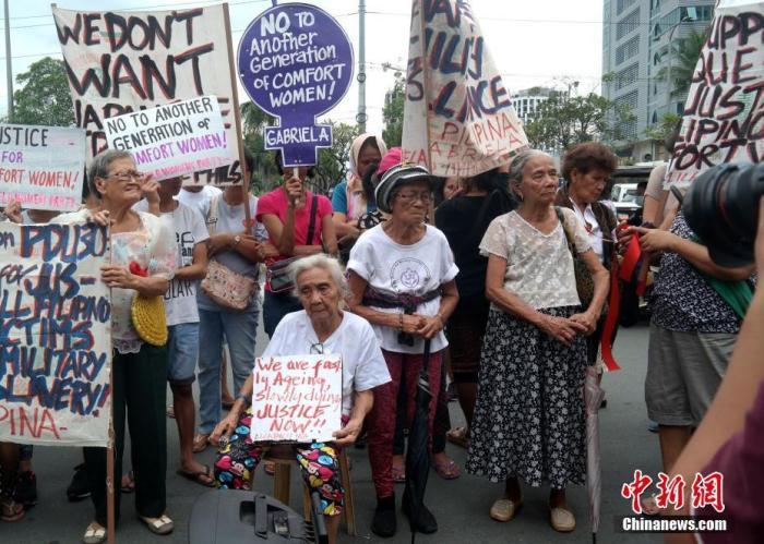 资料图:2017年1月12日,菲律宾多个民间团体在日本驻菲大使馆前举行集会抗议活动,要求日本政府向慰安妇受害者正式道歉、赔偿。图为4名菲籍慰安妇受害者参加当天抗议活动。中新社记者 张明 摄