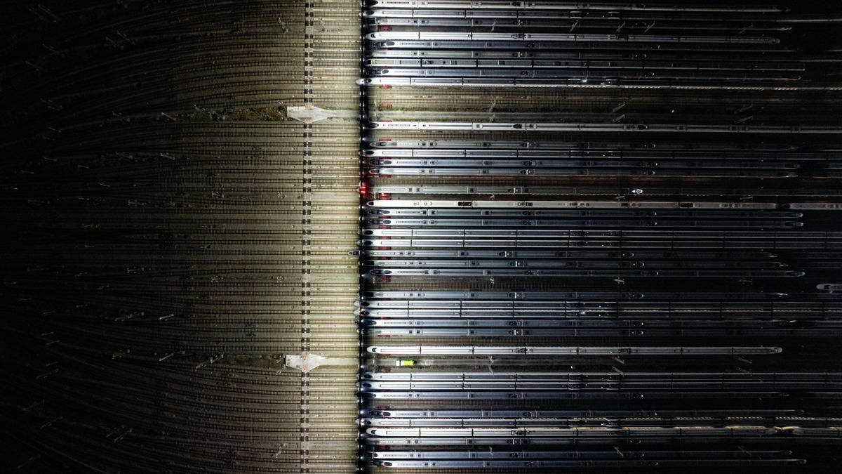 图为整齐排列等候出征的高铁列车。(湖北日报全媒记者 何宇欣 通讯员 柯尊玮 魏平 实习生 苏熙智 摄)