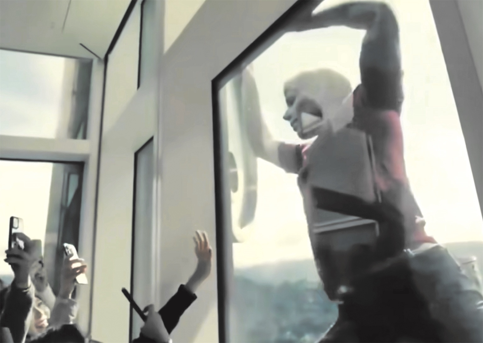 每爬上一个重要节点,他都会转身挥手跟地面上围观的人们挥手互动。101大楼内,不时有人在窗边举着手机对着他狂拍,他也笑呵呵地跟窗内的人们打招呼。霍诺德的妻子桑妮特地在60层处,隔着大玻璃窗为他加油。