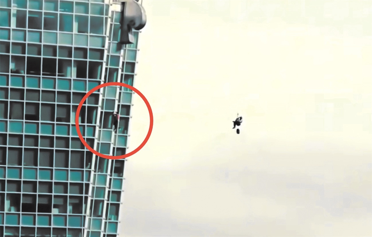 攀爬中最困难的部分,是101大楼建筑结构上的“竹节”。每一节是八层楼,这些区段是外凸的,大概倾斜10到15度,相当陡峭。大楼每八层楼有一个平台,他必须连续进行将近30米的高强度攀爬,才能抵达下一个平台,然后再重复一次。这对体能的要求特别高,绝对是最消耗体力的部分。