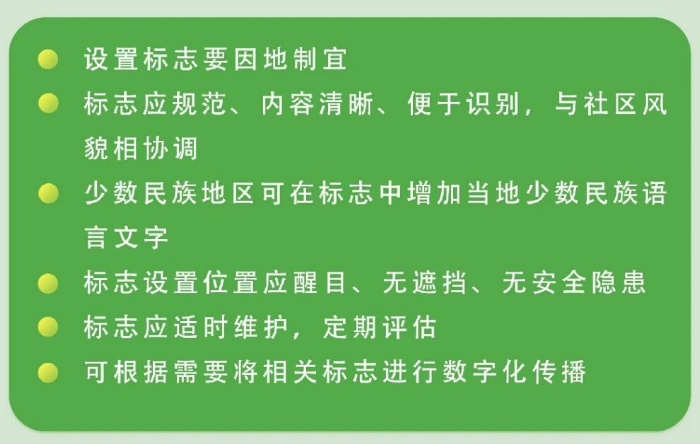 标志在使用时,除了有图形,还会配合相应文字,说明标志的内容。此外,少数民族地区可视情况在标志中增加当地少数民族语言文字,确保居民能看懂。