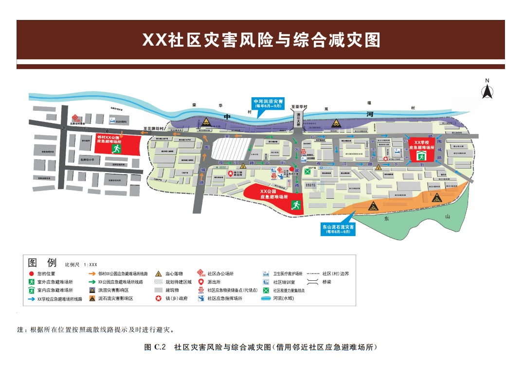 社区灾害风险与综合减灾图:综合展示社区内灾害风险种类及隐患点位置或区域、社区综合减灾场所位置、疏散线路等信息;