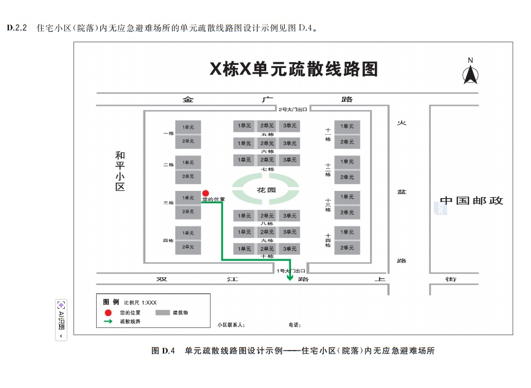疏散线路图:标明当前区域内向应急避难场所疏散的方向和线路,包括住宅小区(院落)疏散线路图、单元疏散线路图和散居住户疏散线路图。