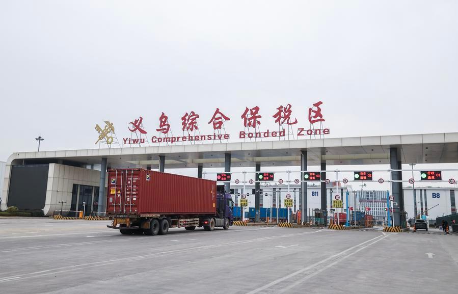 A container truck loaded with imported goods enters the Yiwu Comprehensive Bonded Zone for bonded storage, in Yiwu, east China's Zhejiang Province, Jan. 30, 2026. (Xinhua/Xu Yu)