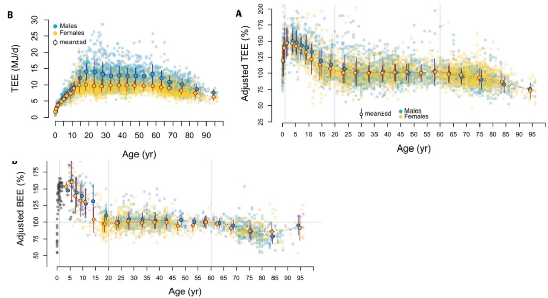 2021年发表在《科学》(Science)杂志的一项研究对人的每日能耗进行了分析。这项研究的规模和范围前所未有:受试者来自29个国家,共6421人,最大的95岁,最小的只有8天。基于研究数据,他们绘制了人类一生中的能量代谢变化曲线。