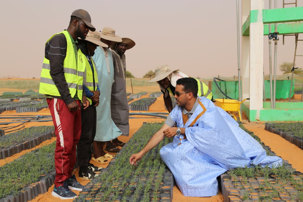2025年5月22日,在毛里塔尼亚西部特拉扎区比尔·巴尔卡村,中非绿色技术公园毛里塔尼亚示范项目毛方协调员图拉德·迈杜向工人传授固沙植物种植技术。新华社记者 司源 摄