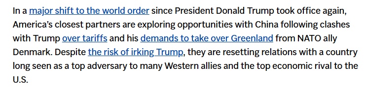 文章说,近期,美国的西方盟友们正在寻求与世界第二大经济体建立更密切的关系。加拿大总理卡尼访华,大幅削减对中国电动汽车等关税。英国首相斯塔默访华修复了两国近年来的紧张关系,还有法国总统马克龙、爱尔兰总理马丁、韩国总统李在明、芬兰总理奥尔波也在过去几周访问了中国。