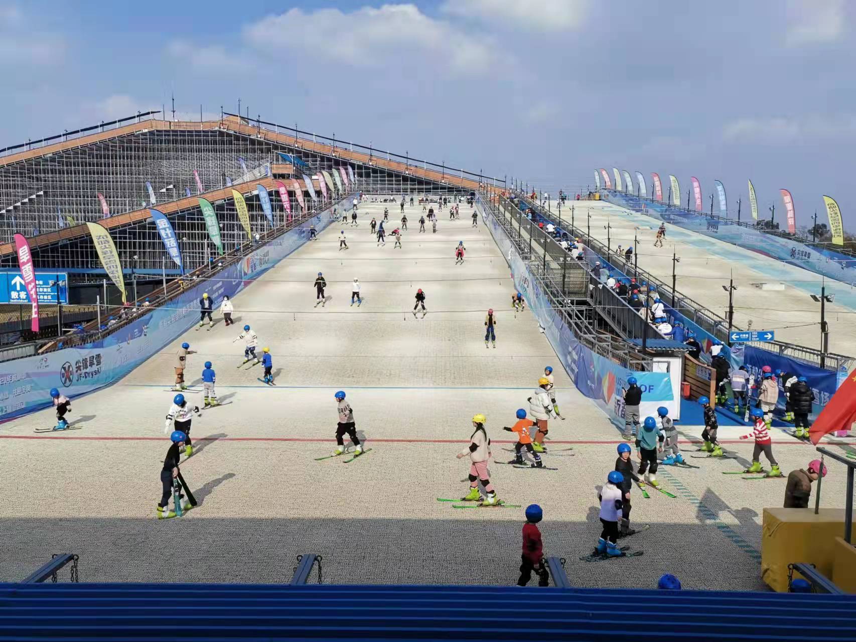 在成都新都,尖锋旱雪四季滑雪场内热潮涌动——100米长的雪道上,身着专业滑雪服的运动员高速滑行,雪板划过“雪面”发出“沙沙”声,脚下是一簇簇排列整齐的塑料“金针菇”。这些“金针菇”是尖锋自主研发的滑雪新设施。